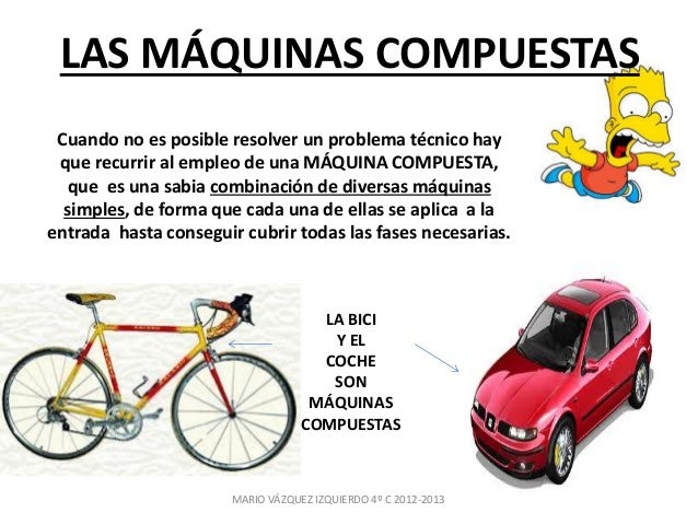Por favor es para hoy 1 Ver respuesta. Una bicicleta por ejemplo es una máquina compuesta que une ruedas palancas y poleas. Por último podemos ver que algunas de ellas son esencialmente mecánicas como la bicicleta o electrónicas como el ordenador.